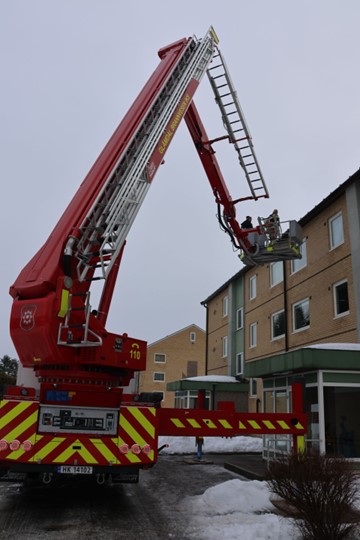 Utenfor en blokk på Langeland står Glåmdal Brannvesens stigebil oppstilt og rundt driver brannfolkene og gjør klar til å heise opp kurven med redningsfolkene i. Det hele kan se dramatisk ut for de som ikke vet at det hele bare er en oppvisning i hva den store stigebilen kan gjøre.